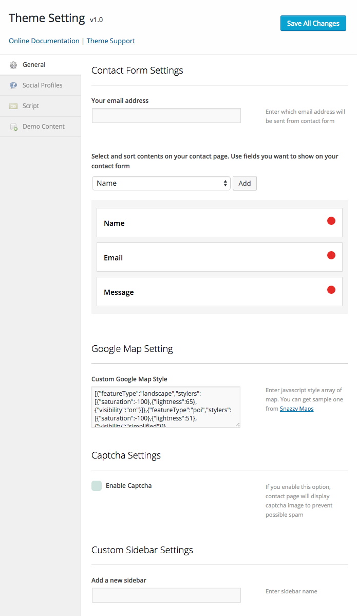 Theme Setting > General for contact form settings, google map, captcha and custom sidebar